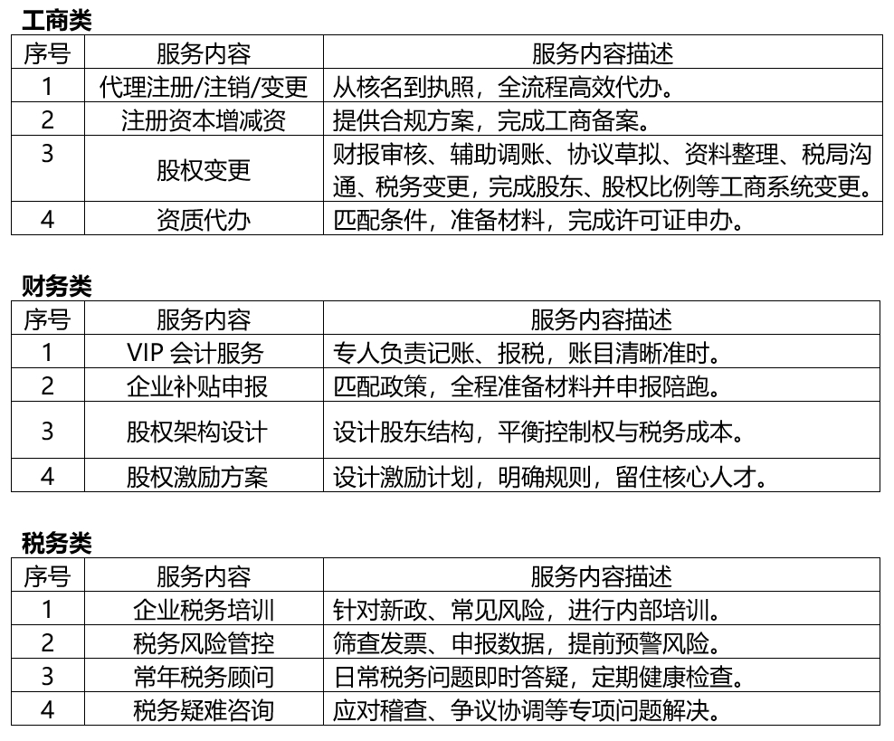我们专注于为各类企业提供贯穿生命周期的财务、税务及工商事务解决方案,紧扣“合规管控、效率提升、成本优化”三大主线,协助企业在经营中实现账务清晰、税负合理、登记无忧,全面提升运营规范性与抗风险能力。